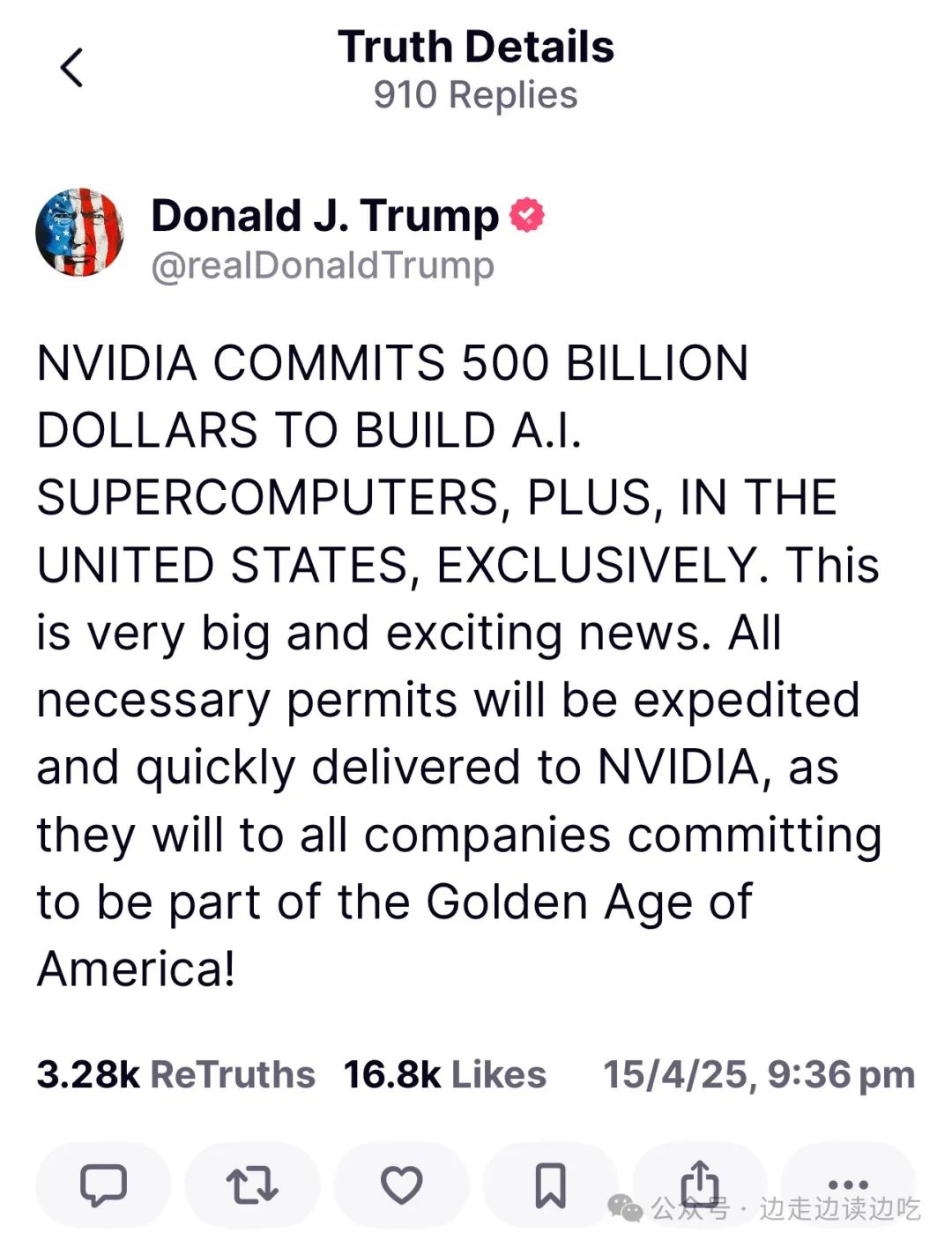 → "英伟达承诺投入5000亿美元在美国独家建设人工智能超级计算机。这是一个非常重大且激动人心的消息。所有必要的许可证将迅速发放给英伟达,因为他们将共同参与美国的黄金时代!"