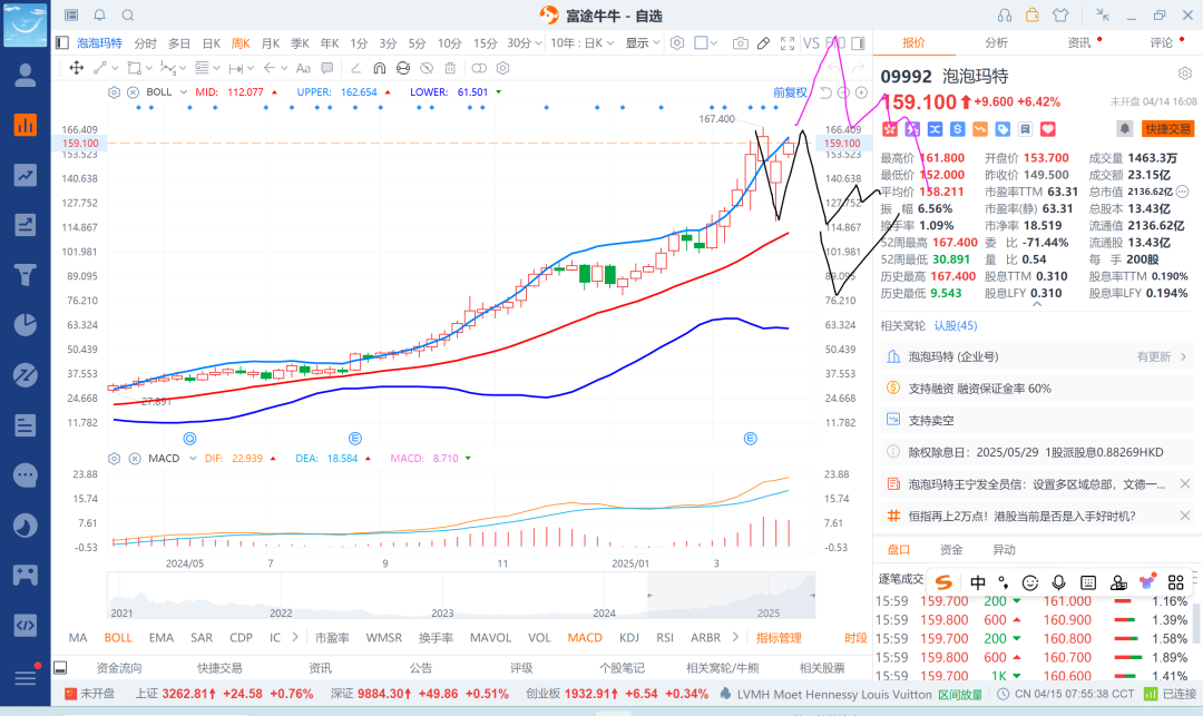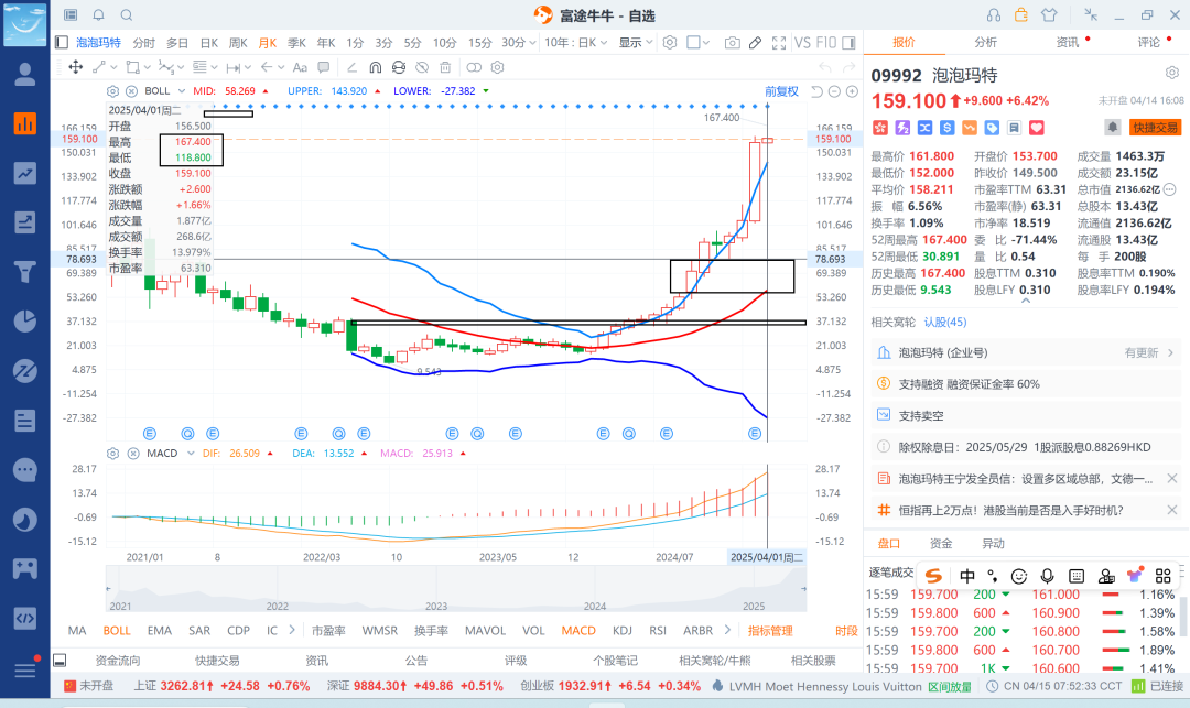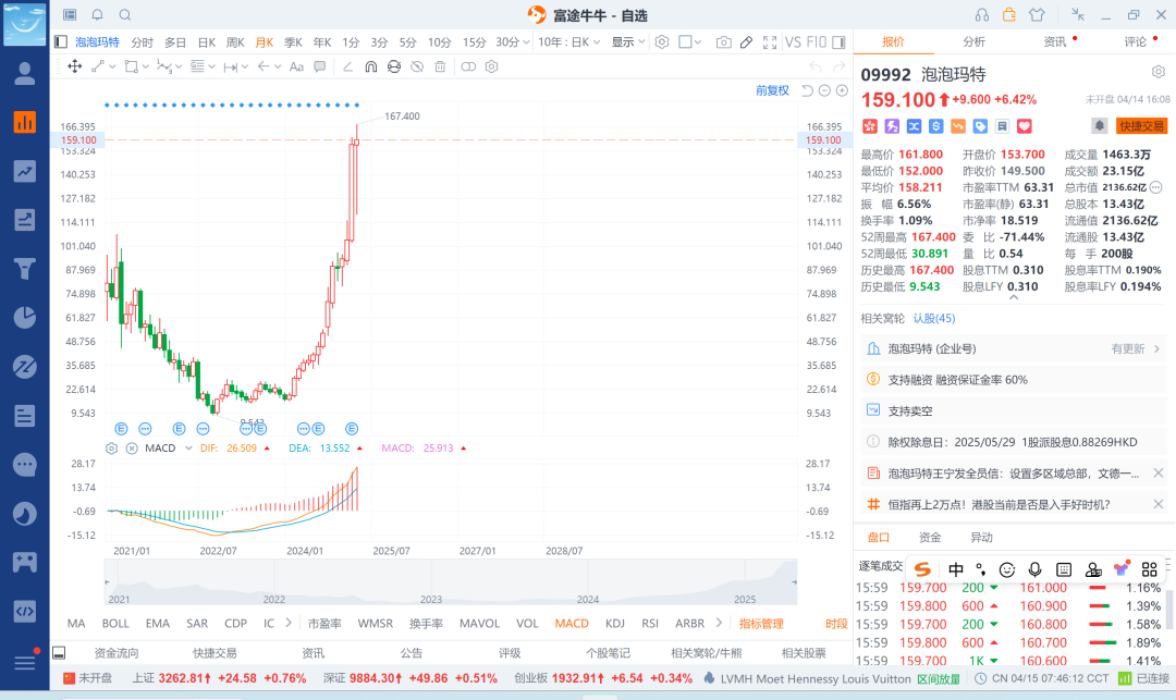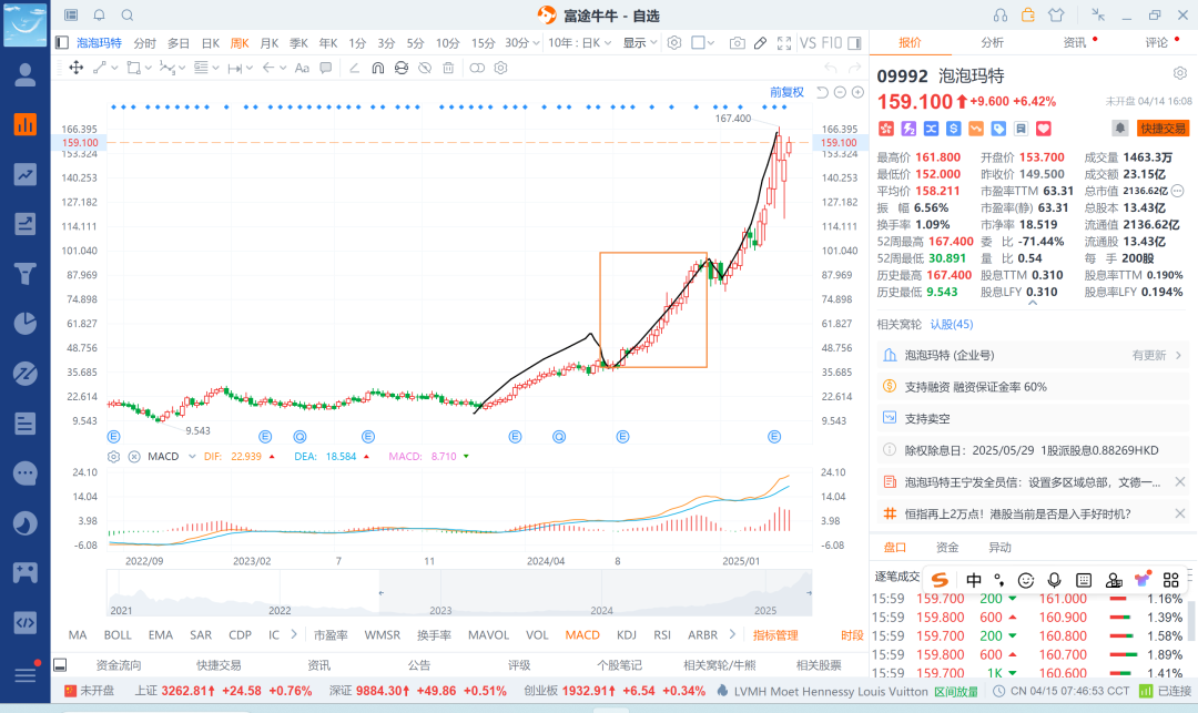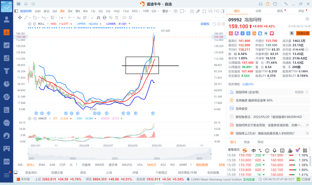 目前港股的热点小米,腾讯,泡泡,老铺黄金,蜜雪等等都是热点,而且都跌了,毕竟港股指数都跌了二三十,他们怎么也得跌,多的在这个基础上跌的更多了,但泡泡跌了后又起来了,而且不少人坚定的看现在不贵,这个就看怎么看了,如果未来持续成长不算贵,但如果利润下来了,成也萧何败也萧何,那么杀跌就非常快了,这里怎么看都不是做多位置,那么不是多就是空的机会了,不过是最次的空罢了,何况从最低位到现在都涨了快接近20倍了,怎么样的业绩也维持不了这样的涨幅,就算前面低估了一半,那么也涨了接近十倍之多。