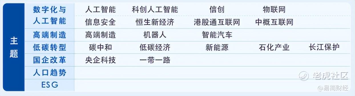 具体包括数字化与人工智能、高端制造、低碳转型、人口趋势、ESG、国企改革。