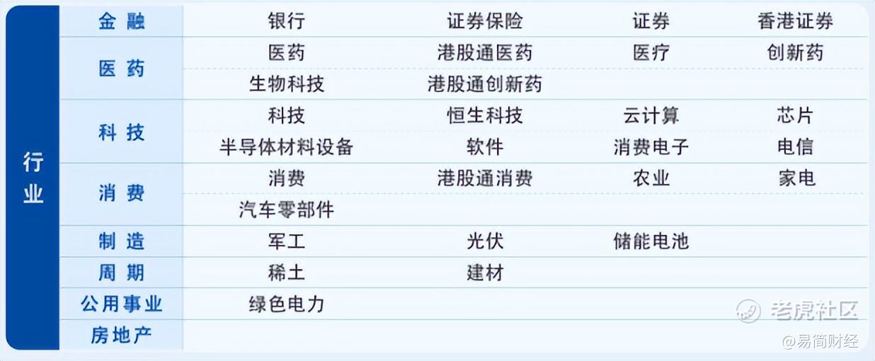 具体包括:金融、医药、科技、消费、制造、周期、公用事业、房地产。