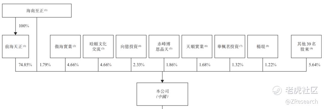 据招股说明书,截至港股IPO前,创始人敬玥女士通过海南至正和前海天正合计持股76.64%,傲海实业持股4.66%,含颐文化交流持股4.66%,向意投资持股2.33%,赤峰伯恩晶天持股1.86%,天顺实业持股1.68%,华枫茗投资(员工持股平台)持股1.32%,杨琨持股1.22%,其他39名股东持股5.64%。