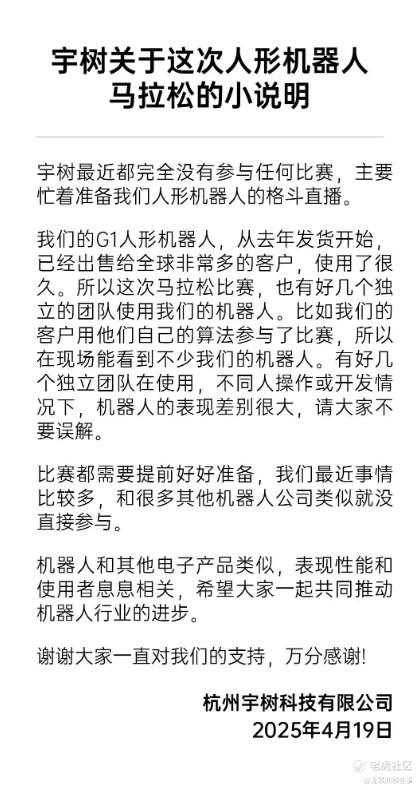 大意是宇树最近把精力都放在了“人形机器人格斗直播”上,所以本次半马并非宇树官方下场竞技,而是客户购买机器人后的个人选择。而且机器人的最终表现结果,也会因为操作人员的不同、开发情况的不同出现差异,还请大家不要因为这次比赛产生误会。