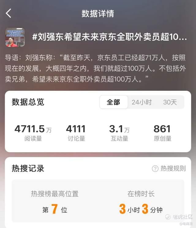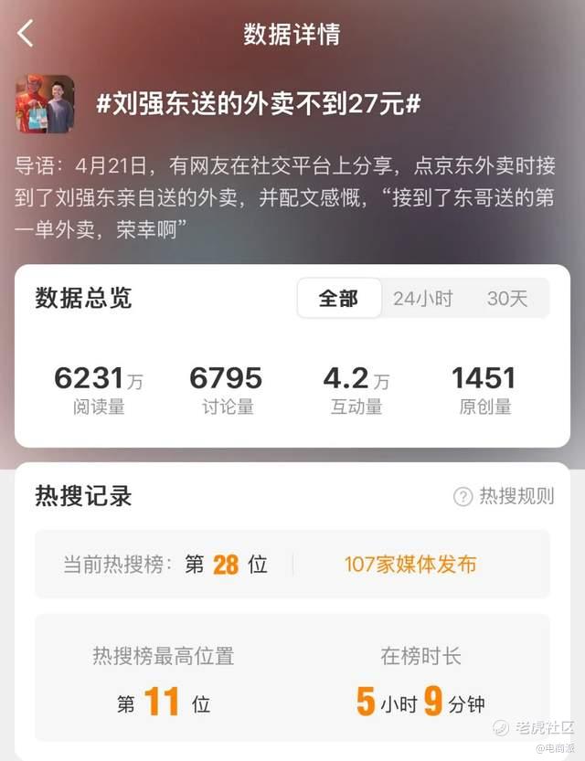 这一顿操作下来,很快,“刘强东亲自送外卖”“刘强东送的外卖不到27元”“刘强东希望未来京东全职外卖员超100万人”“刘强东和外卖骑手喝酒被赞接地气”“刘强东请骑手吃海底捞”等话题火速冲上热搜,引发市场关注。