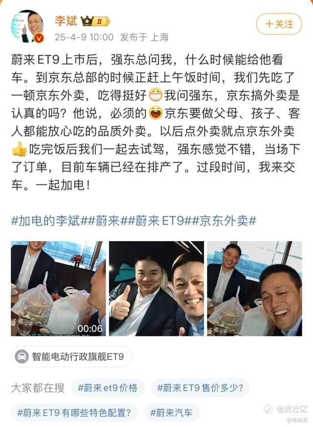 4月9日,刘强东和蔚来创始人李斌同框现身,李斌发布微博提到他跟刘强东在京东总部吃了一顿京东外卖。