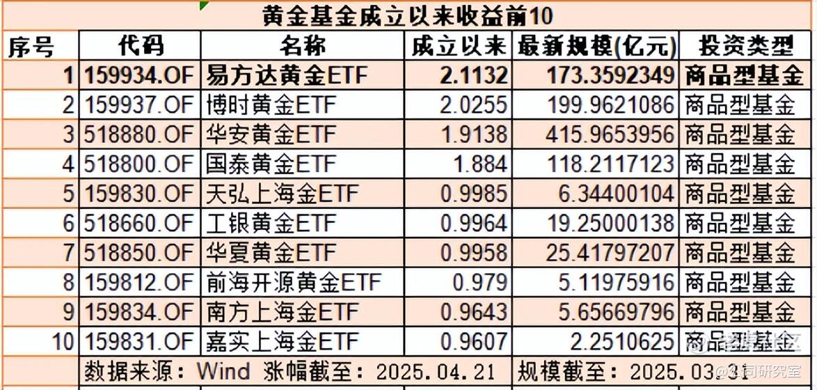 Wind数据显示,截至2025年4月21日收盘,成立以来涨幅前10的黄金基金中,包括易方达、博时、华安、国泰、天弘、工银、华夏、前海开源、南方、嘉实基金公司旗下产品。其中,涨幅最大的是易方达黄金ETF,上涨211.32%;排名第10的嘉实上海金ETF,涨幅也有96.07%。