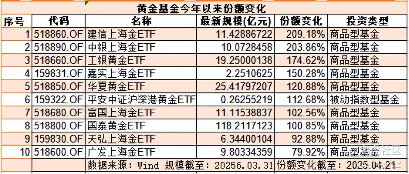 Wind数据显示,截至4月21日,今年以来份额增长前10的黄金基金中,包括建信、中银、工银、嘉实、华夏、平安、富国、国泰、天弘、广发基金旗下产品。