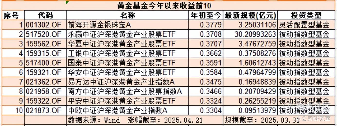 Wind数据显示,截至4月21日,国内涨幅前10的黄金主题基金中,包括前海开源、永赢、华夏、工银、国泰、华安、易方达、南方、平安、中欧基金公司旗下产品,而且全都是股票型基金,其中有6只ETF。
