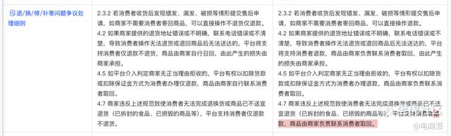 同样对比变更前的规则,京东删除了“仅退款”“退款不退货”等表述;拼多多也删去了售后规则中的“仅退款”字眼,替换为“退款无需退货”的表述。