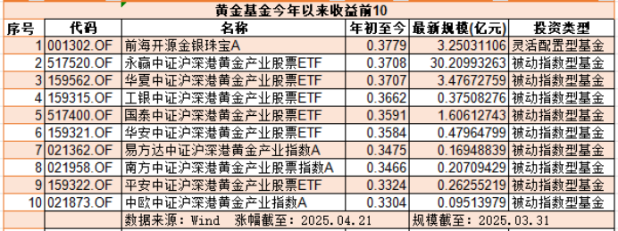 Wind数据显示,截至4月21日,国内涨幅前10的黄金主题基金中,包括前海开源、永赢、华夏、工银、国泰、华安、易方达、南方、平安、中欧基金公司旗下产品,而且全都是股票型基金,其中有6只ETF。