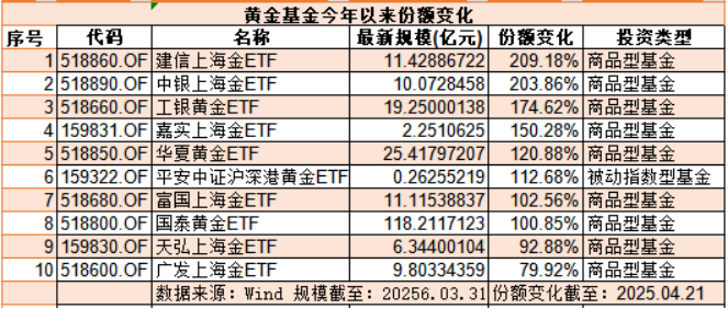 Wind数据显示,截至4月21日,今年以来份额增长前10的黄金基金中,包括建信、中银、工银、嘉实、华夏、平安、富国、国泰、天弘、广发基金旗下产品。