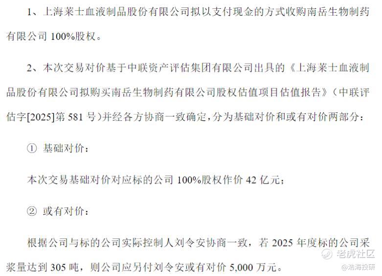 上海莱士关于收购南岳生物100%股权的公告 来源:公司公告