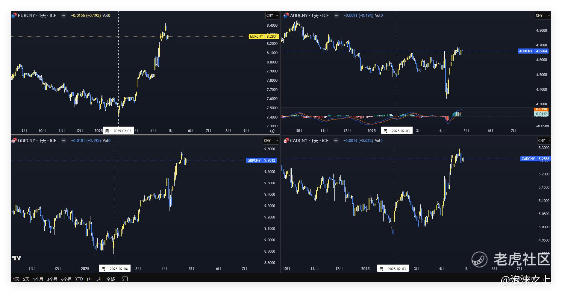 可以看到25年2月开始中对欧的货币就出现了主动贬值,力度很夸张,3个月不到欧元/人民币从7.4-8.4,英镑/人民币从8.8-9.8,反观其他US盟友就平平了,澳元/人民币表现很温和,基本就是区间内部小幅波动,这从外交态度上就能看出来。 加元/人民币表现有点加速的迹象,难怪我们最近一直在撩加拿大站队。