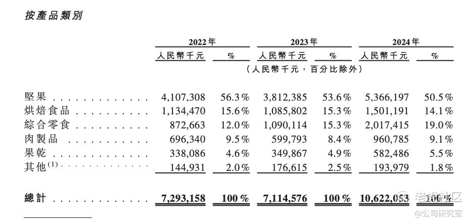 除了坚果之外,目前三只松鼠的品类还包括烘焙食品、零食组合、肉制品及干果等。2024年,坚果仍然是三只松鼠的最大收入支柱,占比超过50%,但从过去三年的趋势来看,坚果占比在不断减少。