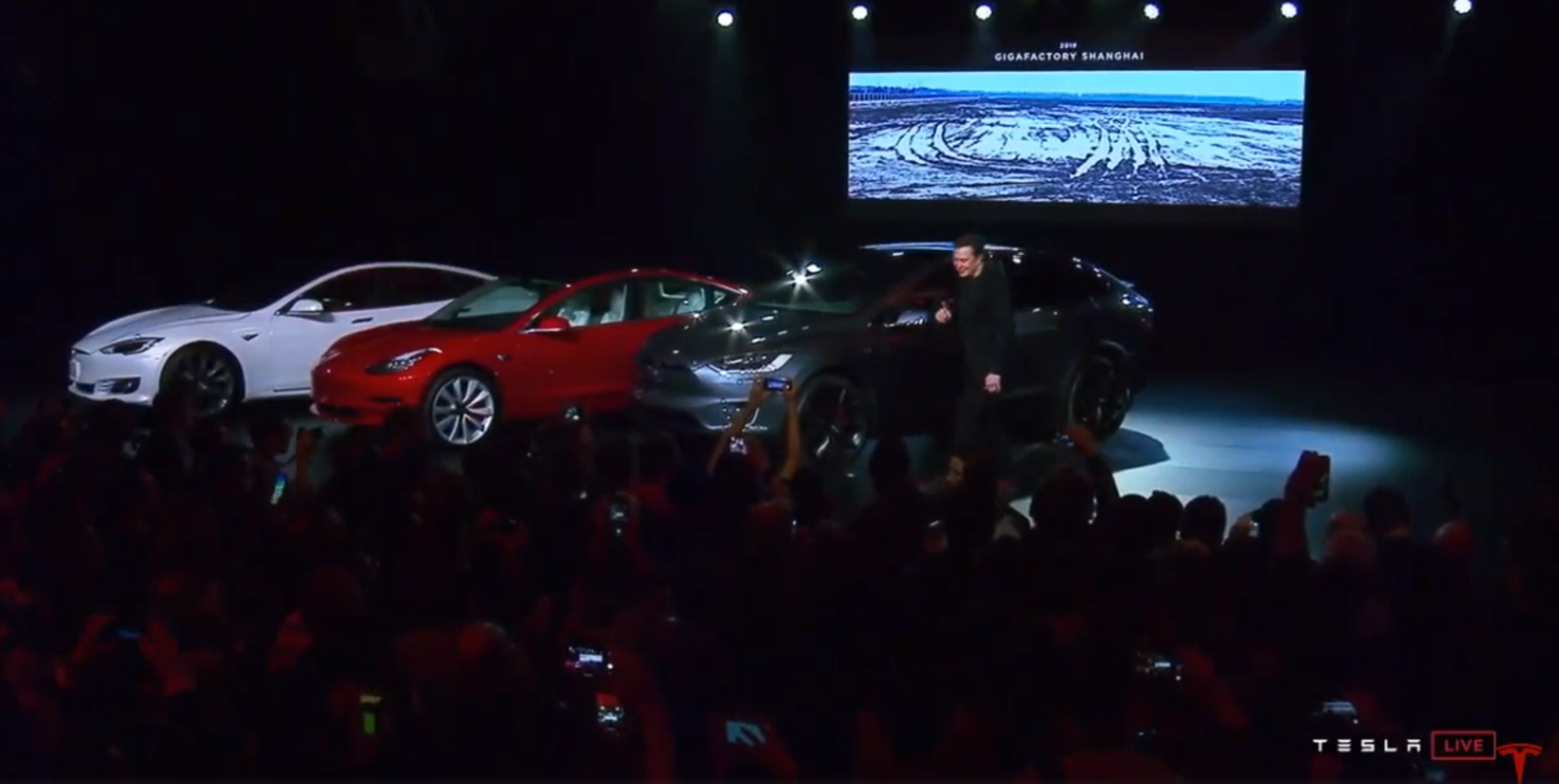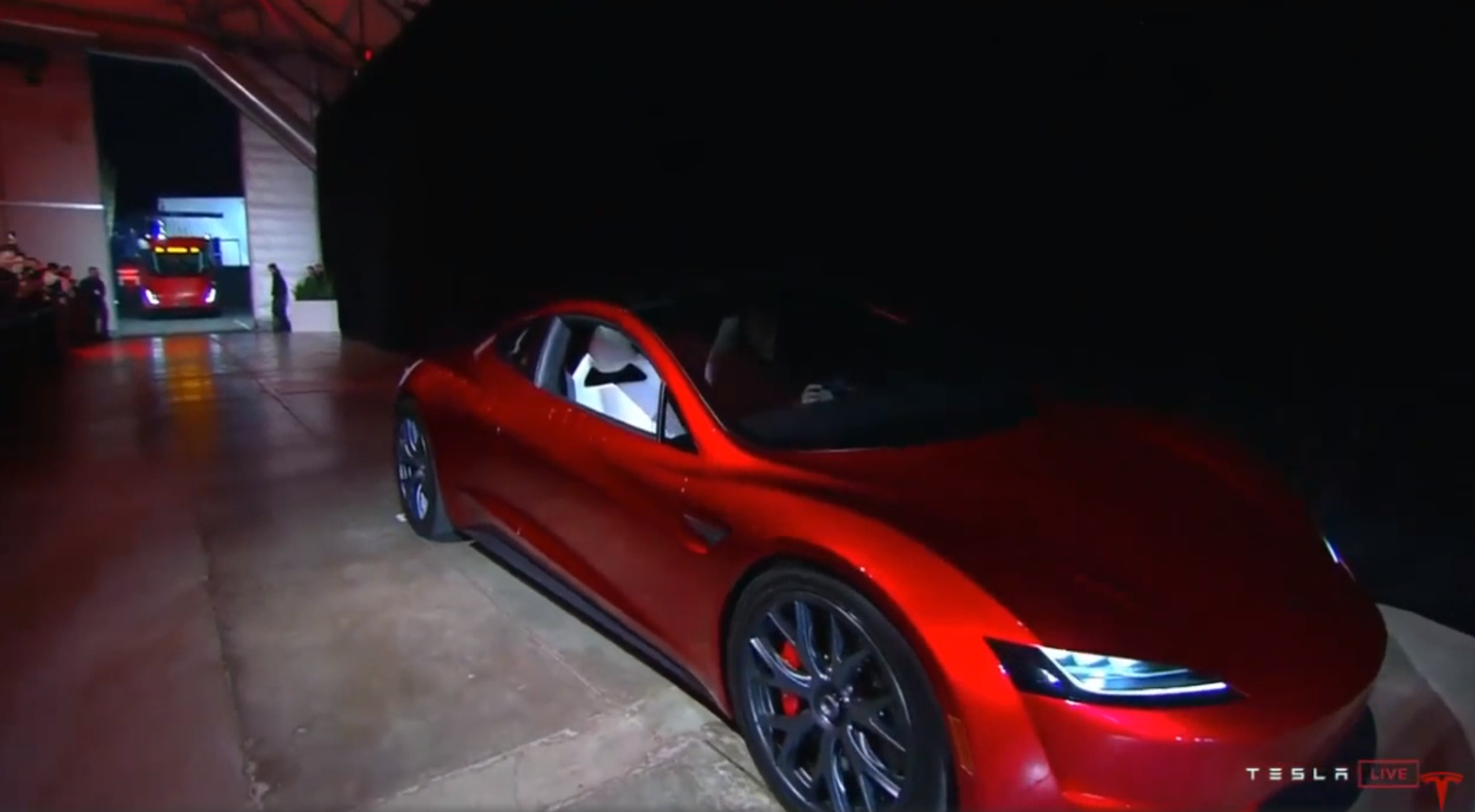 发布会开始,马斯克展示特斯拉目前推出的汽车:Roadster,Model S,Model X,新款Roadster和Semi Truck。
