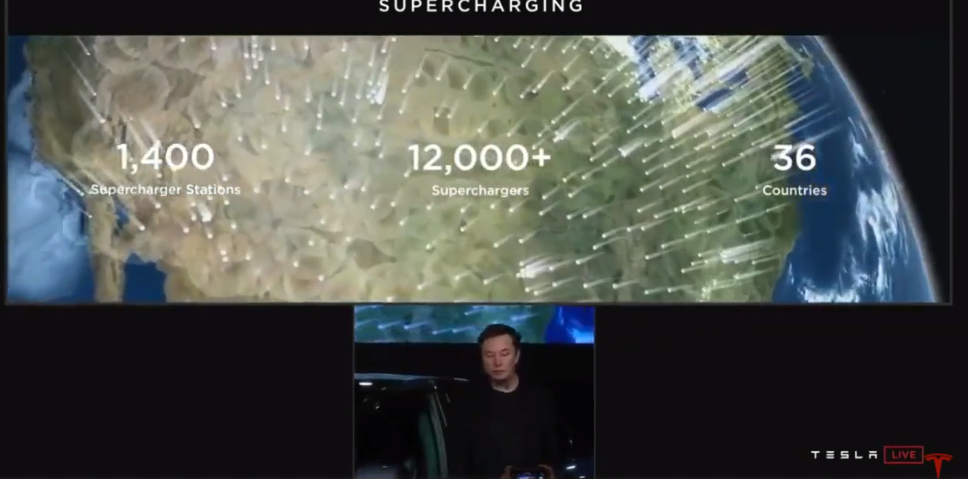 马斯克公布了特斯拉SuperCharging充电站的情况:1400个充电站,超过1.2万个充电点。