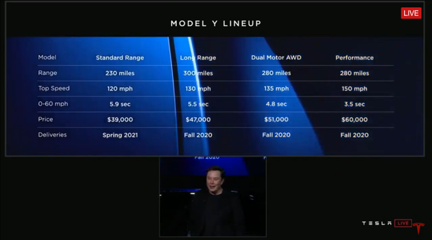 Model Y共有4个版本:1. 标准版:230英里(370公里)续航,最高时速120英里(193公里)/小时,0-60英里/小时加速5.9秒,售价3.9万美元,约合人民币26万元,2021年春季交付;