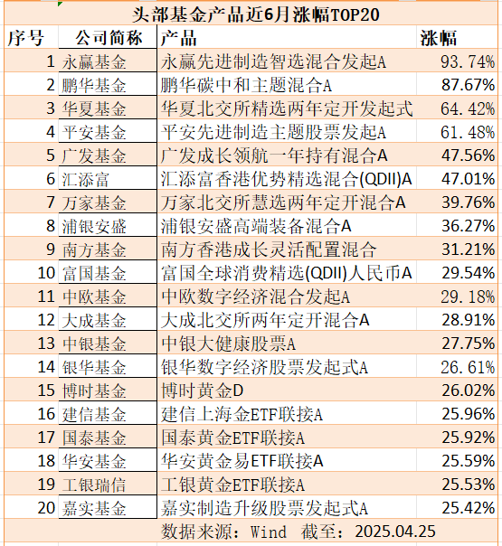 比如,单只沪深300ETF规模就高达3700多亿的华泰柏瑞基金,截至4月25日,近6月业绩最好的华泰柏瑞中证2000指数增强A,涨幅19.36%。而这个涨幅TOP20 榜单上,排在第20名的嘉实制造升级股票发起式A,涨幅25.42%。