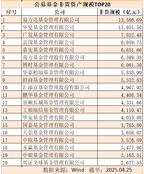 从现存公募非货规模TOP20 榜单看,前5名分别是:易方达,1.36万亿;华夏,1.19万亿;广发,0.79万亿;富国,0.7万亿;嘉实,0.69万亿。