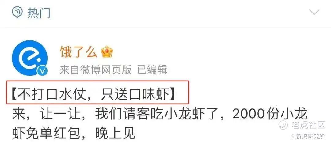 此前,美团跟京东在舆论场上你来我往,饿了么仅在微博上发了一条意味深长的动态:“不打口水战,只送口味虾,2000份小龙虾免单红包。”