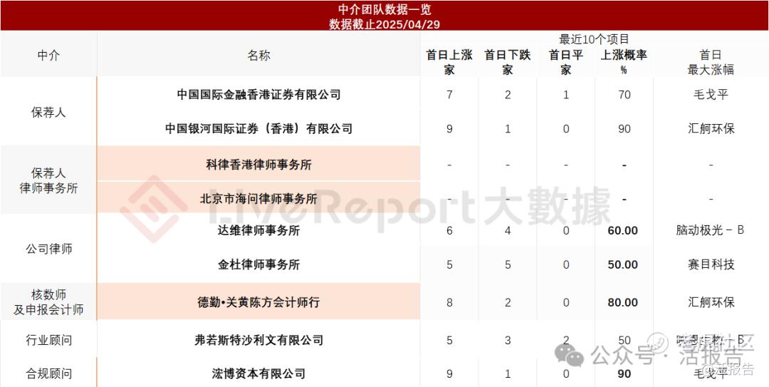 据LiveReport大数据统计,赛力斯中介团队共计9家,其中保荐人2家,近10家保荐项目数据表现一般;公司律师共计2家,综合项目数据一般。整体而言中介团队历史数据表现一般。
