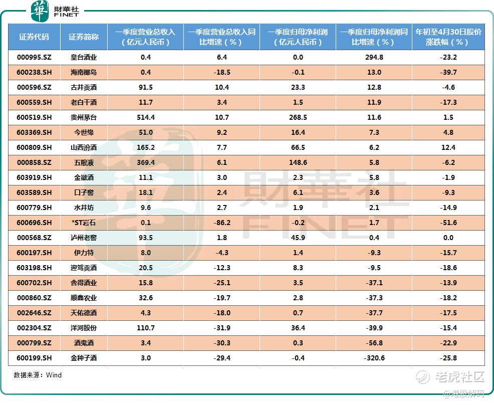 增速方面,11家酒企在一季度实现营业总收入增长,表现最好的是贵州茅台和古井贡酒,增速分别为10.7%、10.4%,其余酒企营业总收入的同比增速均不足10%;此外,还有10家酒企的营业总收入在一季度遭遇下滑,其中酒鬼酒同比下滑30.3%,洋河股份同比下滑31.9%,较为引人注目。
