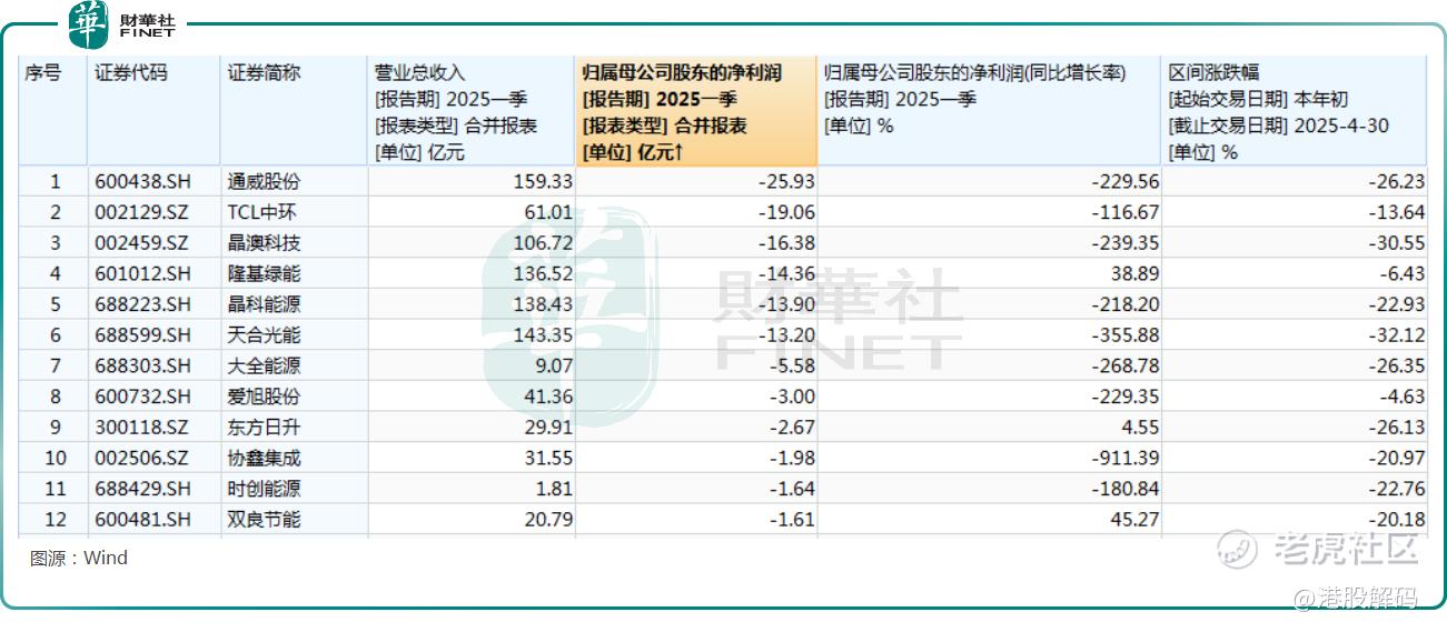 此外,TCL中环、隆基绿能(601012.SH)、晶科能源、天合光能等偏向光伏一体化的龙头企业在2025年一季度也过得比较“艰难”,其归母净利润同比下滑巨大,且普遍出现亏损。