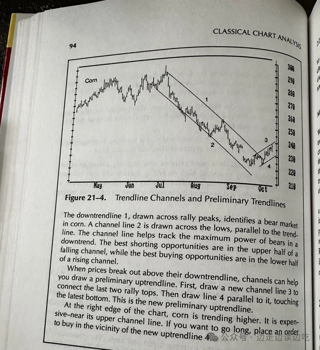 (接昨日:继续阅读《Trading for a living 》,第三章:经典图表分析)。第三章展示了如何通过图表形态去揭示群体行为。其中第21节详细阐述趋势线:怎样画?股价从趋势线的左边跑到右边意味着什么?怎样根据趋势线交易?这些在昨天讲完了。今天讲的是趋势线通道。