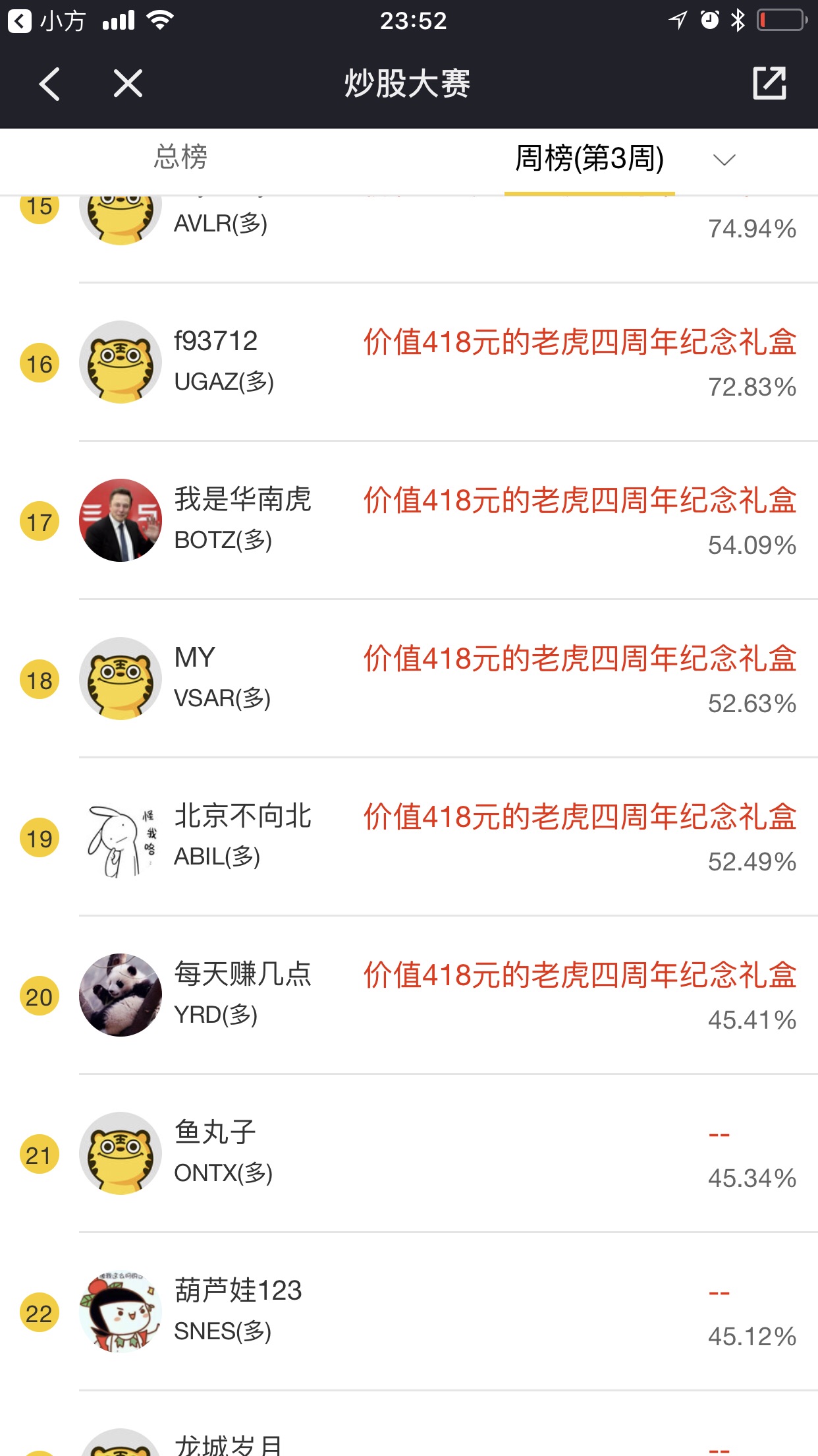 #晒单有奖# 这个月天天加班,一个月只交易了5次,瞎玩的,但胜率还挺高,希望保持吧。上一次比赛结局还让我混了个第50名,这次只有前十估计上不了榜了,忧伤[流泪]