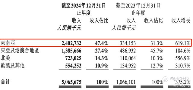 从财报来看,泡泡玛特2024年的业绩增长主要来自海外,尤其是东南亚地区。泡泡玛特2024年的港澳台及海外收入同比增长375.2%至50.66亿元,收入占比近40%。其中东南亚市场营收24.0亿元,占比47.4%,同比增长619.1%。