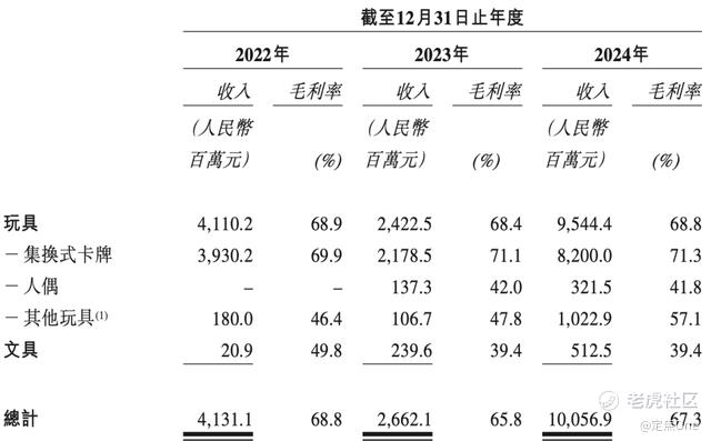 招股书中显示,卡游的卡牌单包销售均价在2024年只有1.7元,毛利率却高达71.3%。即使算上公司的其他玩具和文具业务,2024年综合毛利率也有67.3%,高于泡泡玛特同期的66.8%。