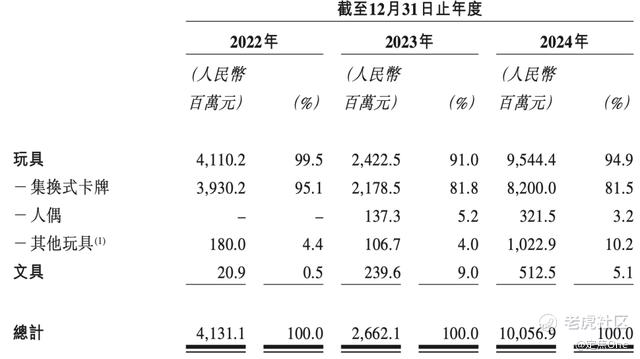 2024年,卡游在卡牌的基础上加入了人偶(人偶也会搭配一张卡牌售卖)和其他玩具(主要是吧唧、色纸、立牌、卡牌收藏册等谷子产品),但是玩具品类依旧占到近95%。