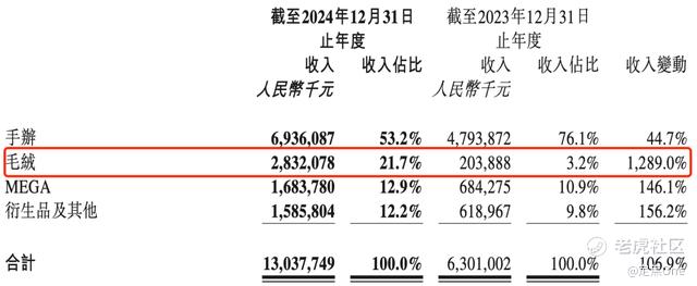 为解决这一问题,泡泡玛特在过去几年积极拓展新业务线。到2024年,盲盒手办收入占比已下滑至53.2%,毛绒玩具收入扩大至21.7%,毛绒类产品收入更实现了1289%的爆发式增长。其中,以Labubu为代表的“搪胶娃娃”异军突起,成为潮玩市场的新晋顶流。