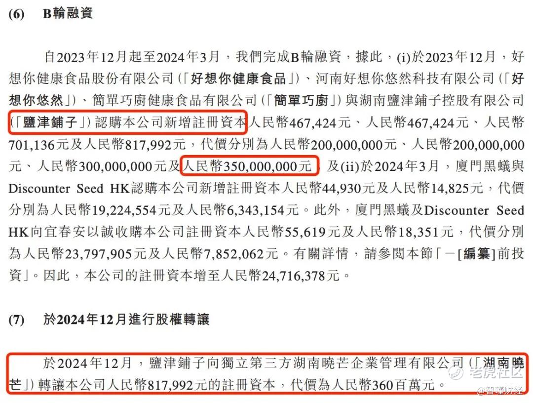 对比可知,这一成本较湖南晓芒收购盐津铺子所持鸣鸣很忙的股权时每股成本57.25元,减少约5.0%,而较B轮融资时的每股成本55.66元亦减少约2.3%。从这个角度来看,鸣鸣很忙的估值有所下降。
