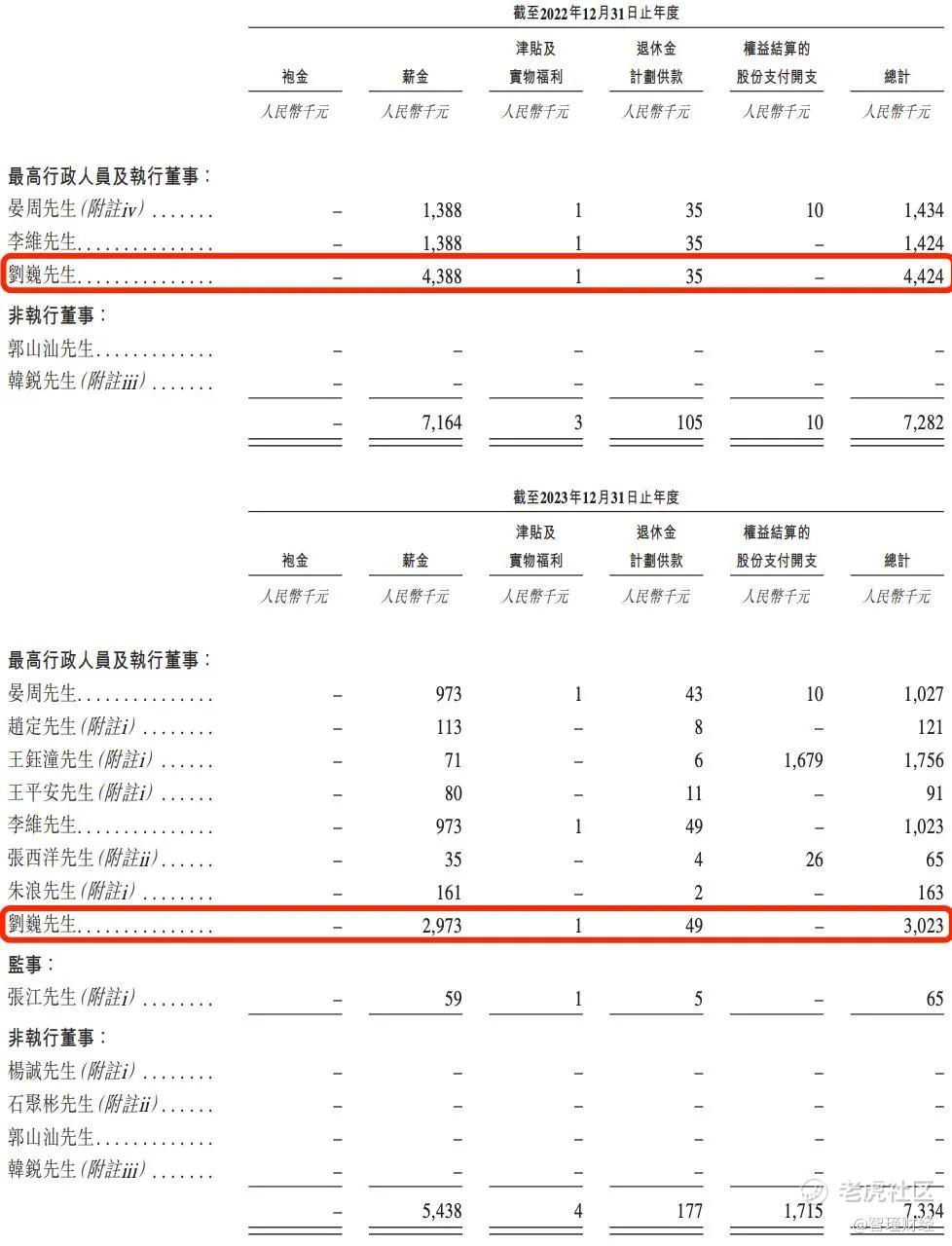 在披露最高行政人员及执行董事板块,刘巍2022年的薪酬总计442.4万元,远高于该公司董事长兼总经理晏周的143.4万元。2023年,刘巍的薪酬总计为302.3万元,同样高于晏周的102.7万元。