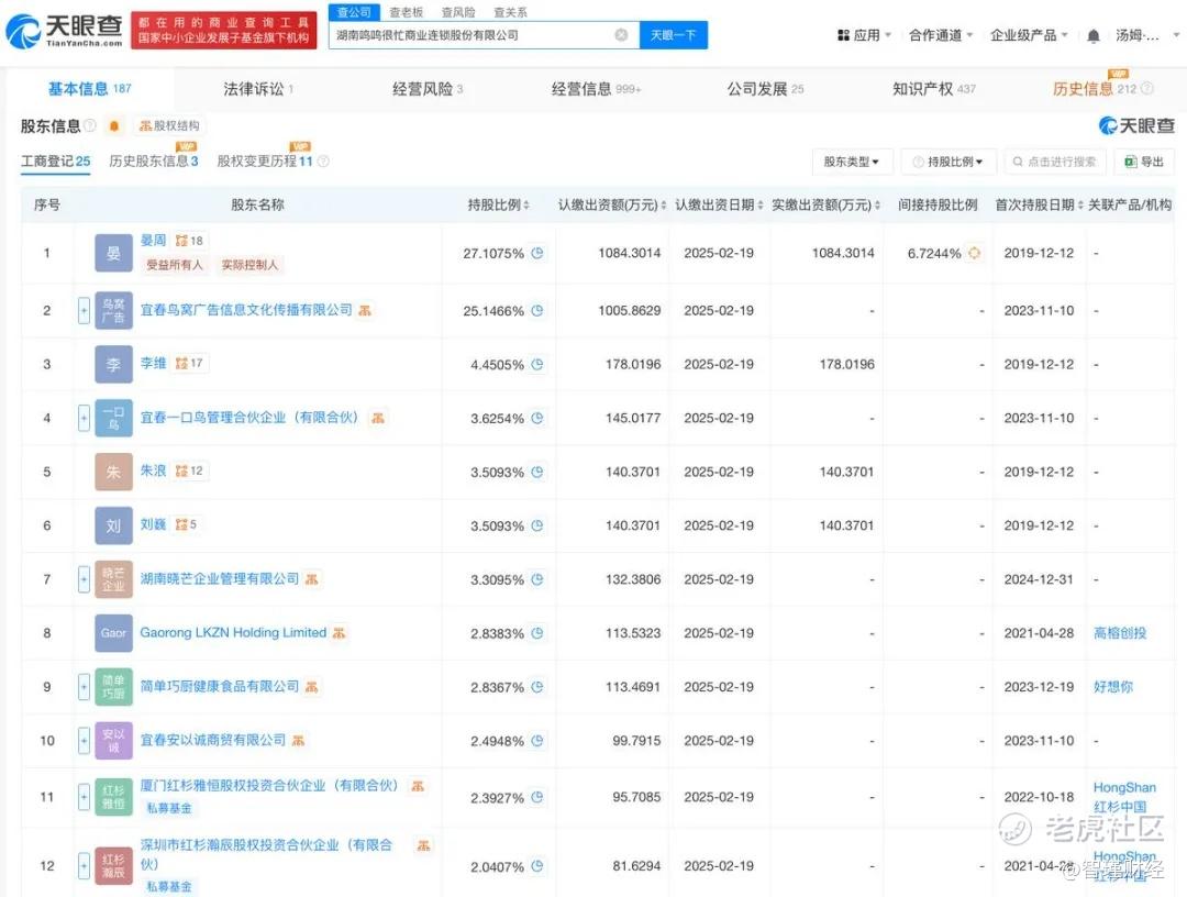 天眼查App信息显示,鸣鸣很忙成立于2019年12月,位于湖南省长沙市,前身为湖南零食很忙商业连锁有限公司。目前,该公司的注册资本为2亿元,法定代表人为晏周,主要股东包括晏周、宜春鸟窝、李维等。