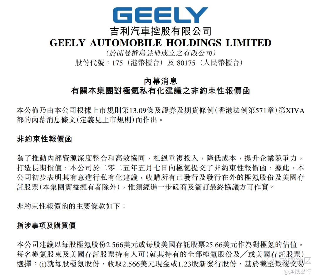 5月7日,吉利汽车发布公告称,已向极氪提交非约束性报价函,计划以每股2.57美元或每股美国存托股票25.66美元的价格,收购其全部已发行股份,这一报价较极氪最后交易日收盘价溢价13.6%。