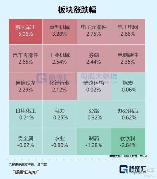 板块方面,航天军工、重型机械、电子元器件等板块涨幅居前,而软饮料、制药、农业等板块跌幅居前。