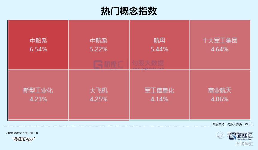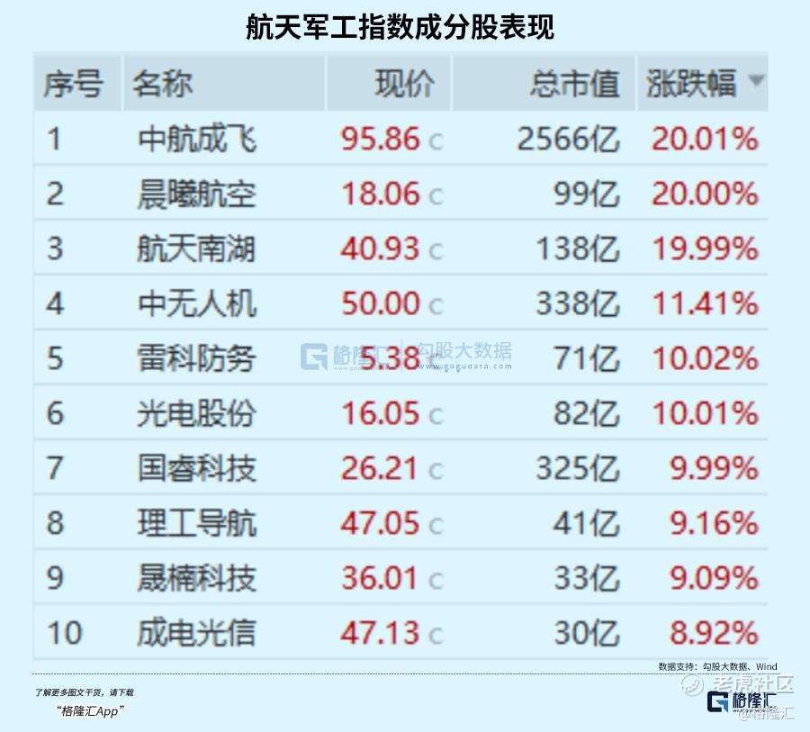 板块内,几只市值超千亿元的龙头股中航成飞、中国船舶、中航沈飞、中国重工均大涨。