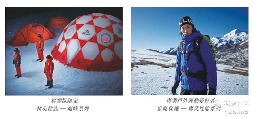 探路者成立于1999年,是核心为全地形户外服饰+极地探险的国民品牌,产品覆盖多个运动类目,包括极限、徒步、跑步、旅行、滑雪等众多产品系列,针对不同年龄段和应用场景差异进行设计,满足消费者的需求。技术方面拥有“TiEF PRO”防水科技,是中国南北极科考队的官方装备,有极寒环境认证,并且公司也是唯一连续20年服务中国南北极科考队的品牌。此外,公司也与中国航天合作,研发抗辐射、恒温户外服。公司的高性价比冲锋衣迅速占据大众市场,通过定价500-1000元的耐用+性价比导向渗透到了广大中年男性户外爱好者中。