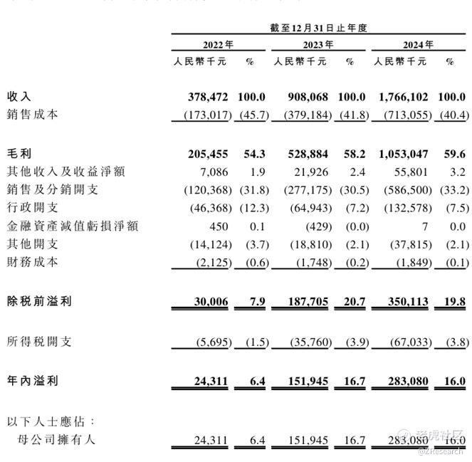 营业收入方面,2022年至2024年,伯希和的收入分别为人民币3.8亿元、9.1亿元、17.7亿元,复合年增长率为115.8%,收入规模增长迅速。主要是由于公司不断推出多元化产品组合,以切合各类客户的偏好,以及高效的市场营销策略提升了品牌知名度。比如2024年10月公司在宣布成毅为品牌代言人后,14小时内在所有线上平台产生了约10亿浏览量及2亿互动量,使得当年线上GMV超过了人民币6,000万元。