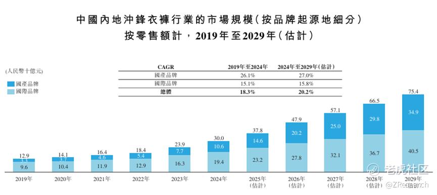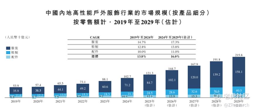 冲锋衣裤是高性能户外服饰行业的重要类别,是为在户外活动中抵御极端天气而设计的高性能外套。通过跨学科整合先进材料、人体工学结构设计及更多智能技术,实现其高性能功能。2024年,中国内地冲锋衣裤市场的零售额在高性能户外服饰行业中占比29.2%。销售市场规模从2019年的人民币129亿元增加至2024年的人民币300亿元,CAGR为18.3%,预计到2029年将增长至人民币754亿元,2024年至2029年的CAGR达20.2%。