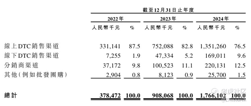 分渠道来看,伯希和有约8成收入来自线上渠道,2022年-2024年分别贡献了3.31亿元、7.52亿元、13.51亿元,虽然对总收入的贡献占比从2022年的87.5%缩减至76.5%,但依旧是大头,并且线上渠道是初创品牌能以较低的成本迅速打开市场的最优方式。
