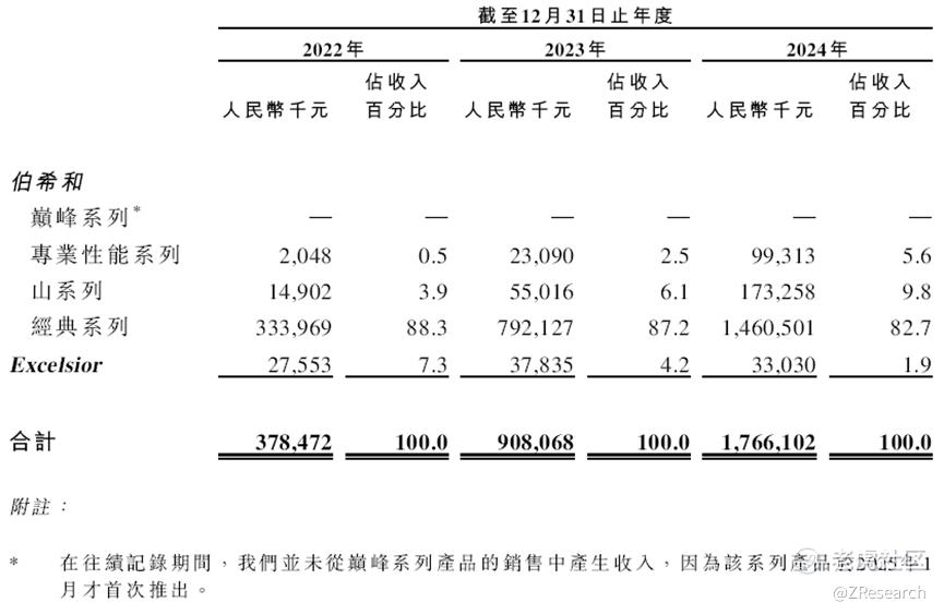 伯希和户外产品组合种类繁多,可满足男女老幼等广泛客户群的需求,适合不同季节及场合。于往绩记录期间,服装及鞋类为公司的主要产品类别,占总销售额的大部分。截至2024年12月31日,伯希和品牌的服装及鞋类产品包括572个标准产品单位(SPU)。建立了四个产品系列,即巅峰系列(2025年1月推出)、专业性能系列、山系列及经典系列。其中巅峰系列及专业性能系列面向专业登山者、户外探险家及户外科研人员,山系列及经典系列则面向户外运动爱好者、旅行者及城市用户。每个系列还提供一系列配套的户外装备及配饰,如登山杖和帐篷,以满足不同用户的需求。