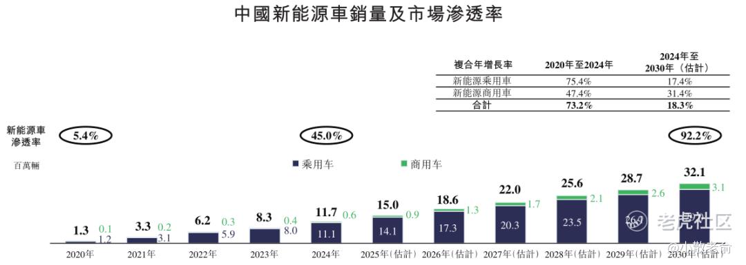中国是2024年新能源车销量最高的国家,共销售11.7百万辆新能源车,预计于2030年将增长至32.1百万辆,2024年至2030年复合年增长率为18.3%。2024年中国新能源车的渗透率达到45.0%,并预计于2030年增长至92.2%。其中,新能源乘用车渗透率预计从2024年48.5%增长至2030年94.5%;新能源商用车渗透率预计从2024年19.4%增长至2030年75.3%。