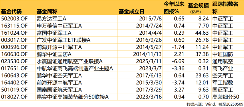 跟踪的指数有中证军工、中证国防、通用航空、商飞产业、空天军工、军工指数、国防军工和高装细分50。