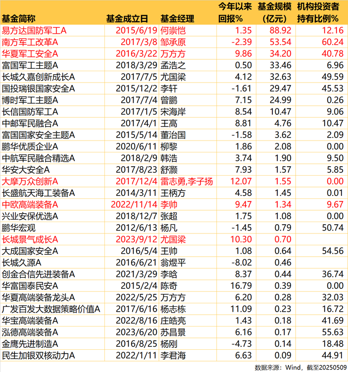 从机构持仓的角度看,邹承原管理的南方军工改革A,苏昌景管理的泓德高端装备A,王帅管理的大成国家安全A,杨凡管理的鹏华宏观以及尤国梁管理的长城久嘉创新成长A,2024年年底机构持仓占比都超过49%,是机构投资者比较信赖的军工主题基金,这几位基金经理在军工领域也相当专注。