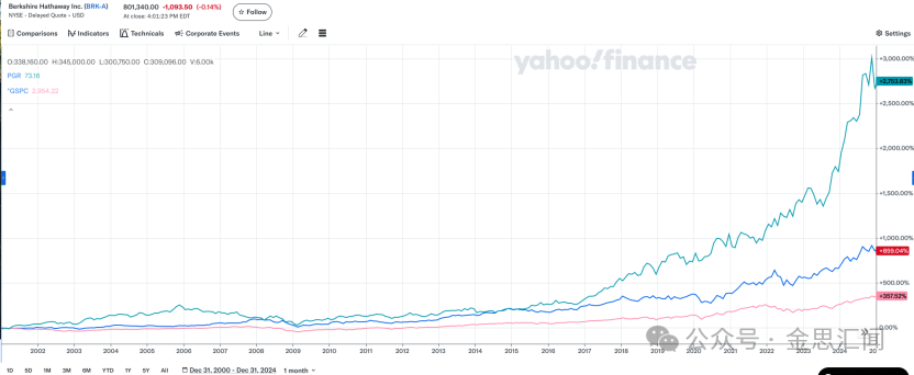 BRKA,PGR,VS 标普500指数 2001年1月到2024年12月31日