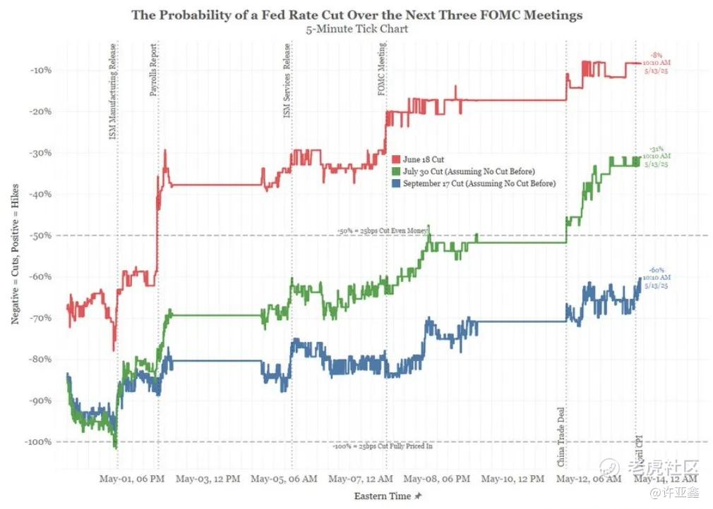 如上图所示,自5月1日以来的每一次主要经济发布(包括FOMC会议)都降低了美联储降息的可能性(垂直虚线)。