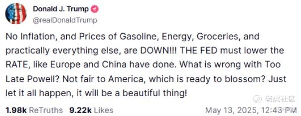 你们看他即便是出访中东三国捞金,还不忘发贴说,“通货膨胀率为零,汽油、能源、食品杂货以及几乎所有商品价格都在下跌!!!美联储必须像欧洲和中国那样立刻降息。太迟先生鲍威尔到底怎么了?这对蓄势待发的美国太不公平了!顺其自然吧,经济即将迎来绚丽绽放!这会是多么美好的景象!”