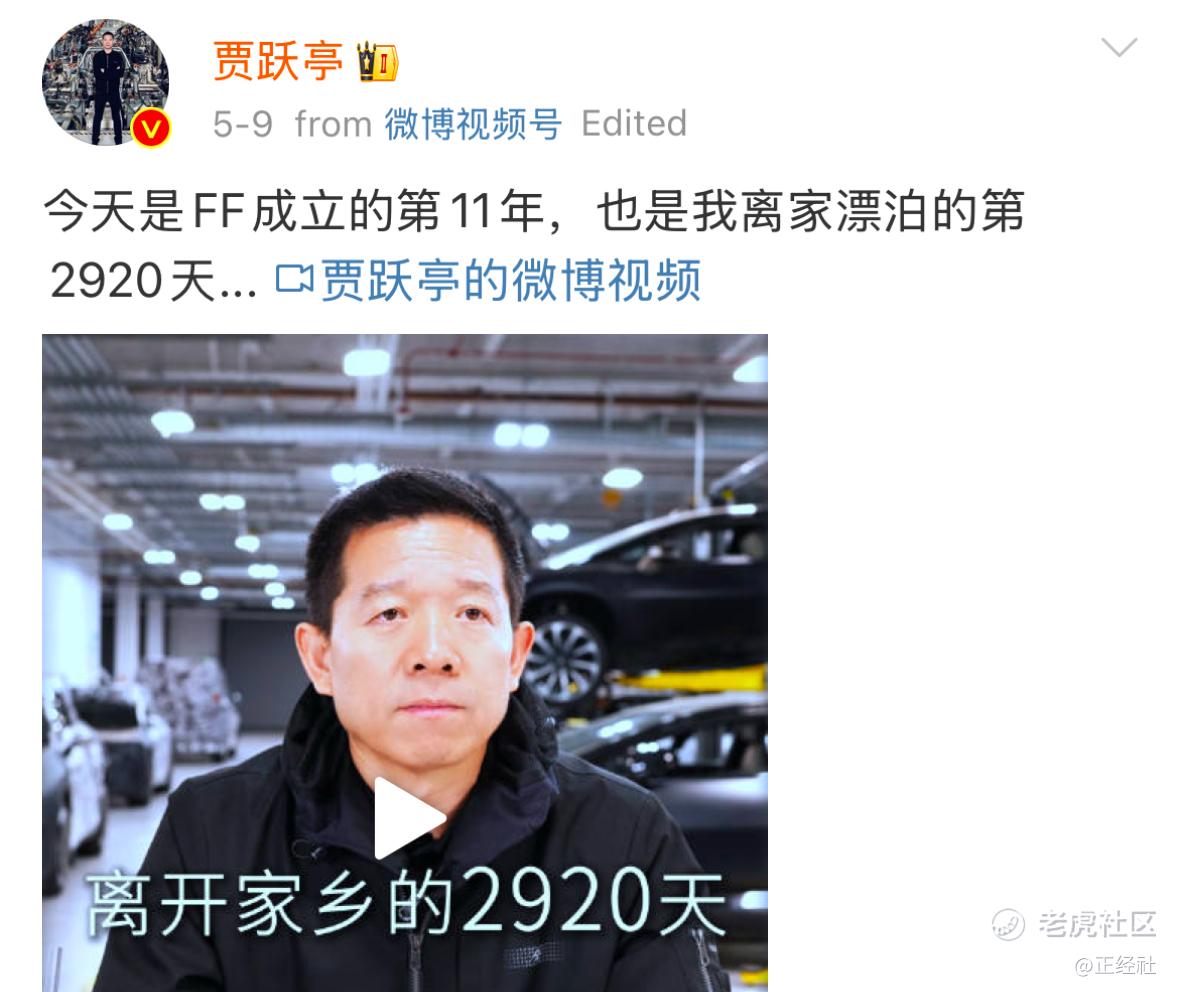 本次事件的男主人公贾跃亭,在不久前的5月9日也发布了动态,纪念FF成立第11周年,主动提及想家想回北京,提到了孩子和爸妈,但没有提到甘薇。